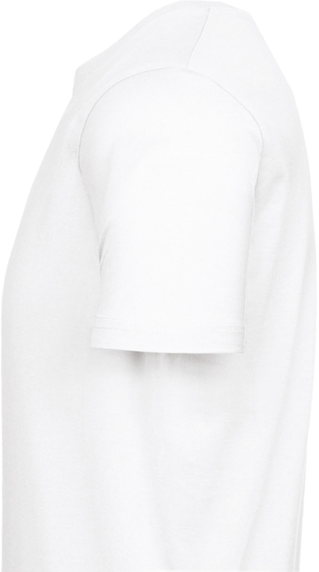 Glatt eingefasster V-Ausschnitt, kontrastfarbiges Nackenband bei farbigen und farbgleiches bei weißen Shirts, Doppelnahtverarbeitung